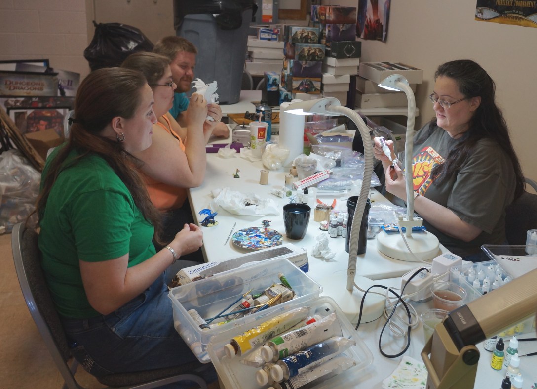 If you don’t have any friends who paint miniatures, you might try asking at your local game store whether they run any events for miniature painters, or if they know of any. If they don’t and they’re interested in the idea, you could consider starting a regular miniature painting event. Some years back I started such a group in Knoxville. It took a fair while to get going (remember people can paint at home of they want, so sometimes you have to be a little patient and keep a regular schedule before they’ll be lured out to join you), but eventually we had a good group of people coming out to each meeting. In the past few years I have been too busy with preparing for and attending conventions to come out to the events, but Cera (front left in the picture below) took over the group. And she’s doing a better job than I ever did. There are now bi-monthly sessions and more than a dozen people come out to each one!