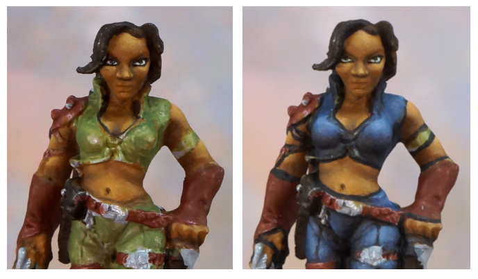 So I stuck with my plan for the skin, but switched to a dull darkish blue colour for the main cloth areas. (The art director also preferred that the figure be painted as if wearing a sleeveless top. As sculpted, I think you could paint it as either sleeved or sleeveless, whichever fits the painter’s taste.)