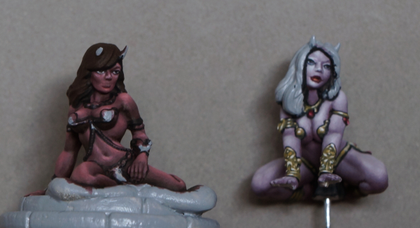 One line of thought was a reflection on the differences in the experience between painting the skin of the first succubus and the second. You might imagine that those experiences would be pretty similar, and in a lot of ways they were. But there were also a lot of differences both in the process and in my feelings of success or frustration at various points during the process. (Pictured below are two of three succubi you can order by adding the Demonic Temptations add-on to your Bones 5 pledge. Also includes three incubi.)