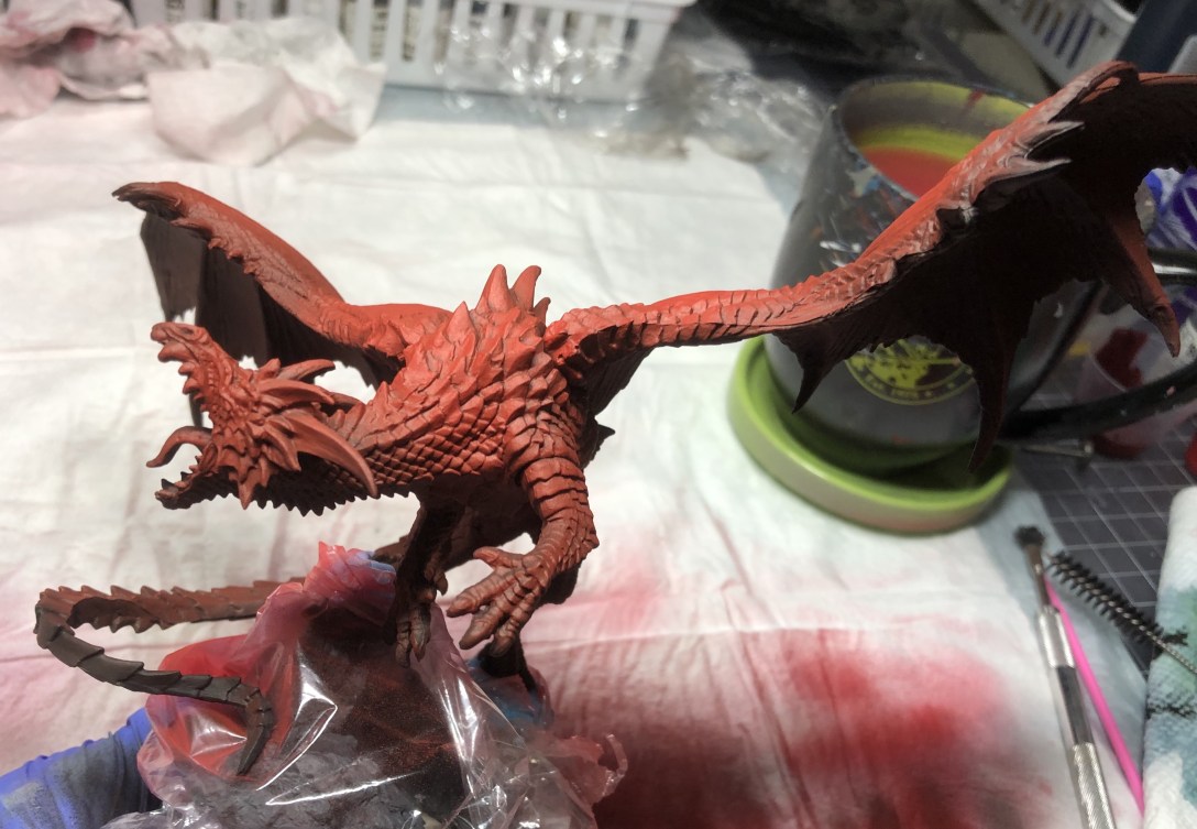 Aaron quickly ran through the steps he would take to airbrush a foundation of paint onto Narthrax. Aaron’s ‘foundation’ would make for a nice looking dragon on most tabletops. I’d be fine just adding some details like talons and teeth by brush and calling it good for game play, but I’ll likely be tempted to fiddle a little more than that. ;-> I painted the first step of shadows during the class, but decided to wait and review the second video before painting more. Others airbrushed more quickly and were able to get some critique on their work at the end of the class. Those of us who were slower are able to post pictures to a Discord group for class members and get feedback on our miniatures, as well as answers to airbrush issues and questions.
