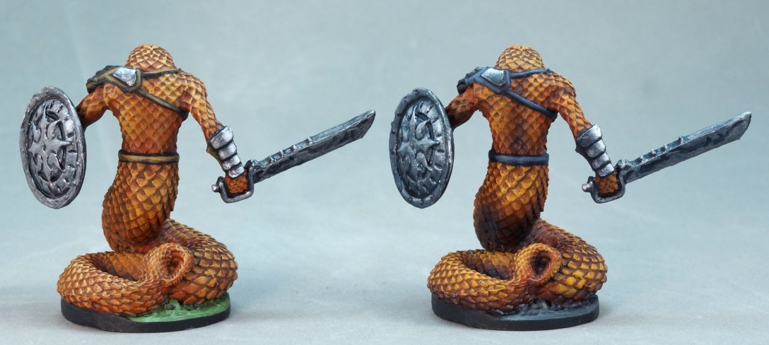 So let’s compare these snakemen to get an example of some of the concepts I’m talking about. In this article I’m going to talk about how your colour choices and figure choices can affect your end result. I’ll also share the kinds of critique comments you might receive on something like the before snakeman from a painting instructor or judge, and address some of the more minor points. The most important concept these figures illustrate is why the miniature community puts such an emphasis on shadow/highlight contrast. Explaining why that is so has grown into an article of its own that I will be posting soon!