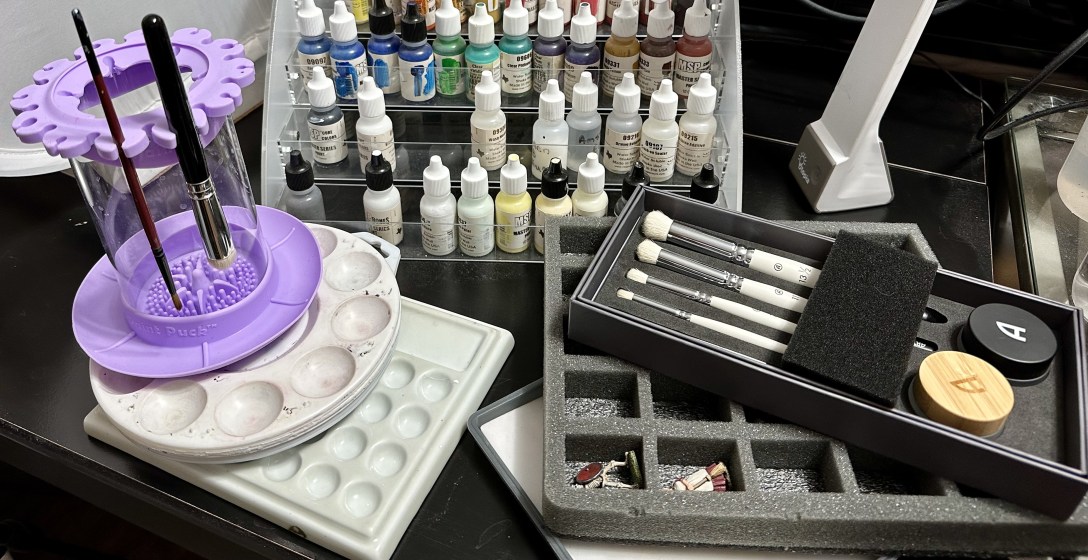 What if you took a silicone brush texture pad and spun it on a motor? The product that answers that question is too weird for me not to share. I suspect the cup and textures are out of scale to detail brushes, but I have to admit I’m tempted to try this for larger brushes like I’d use on terrain or canvas painting because I find those such a pain to clean.